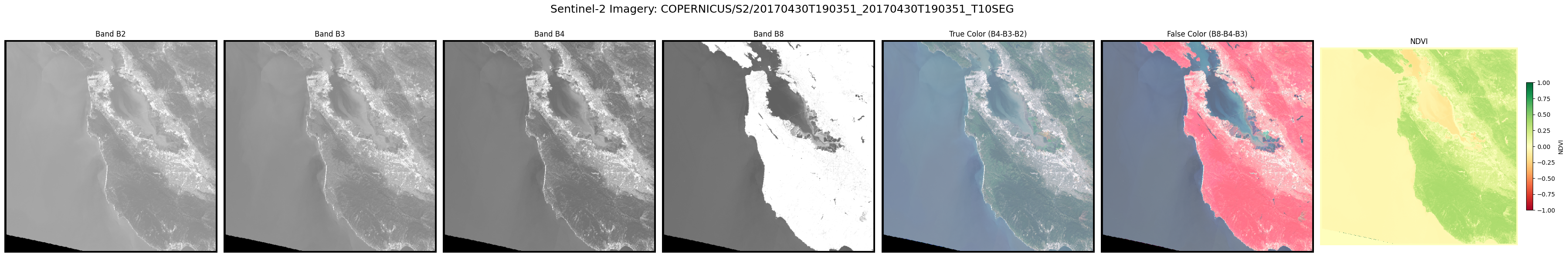 # 11. Combined visualization: B2, B3, B4, B8, True Color, False Color, NDVI