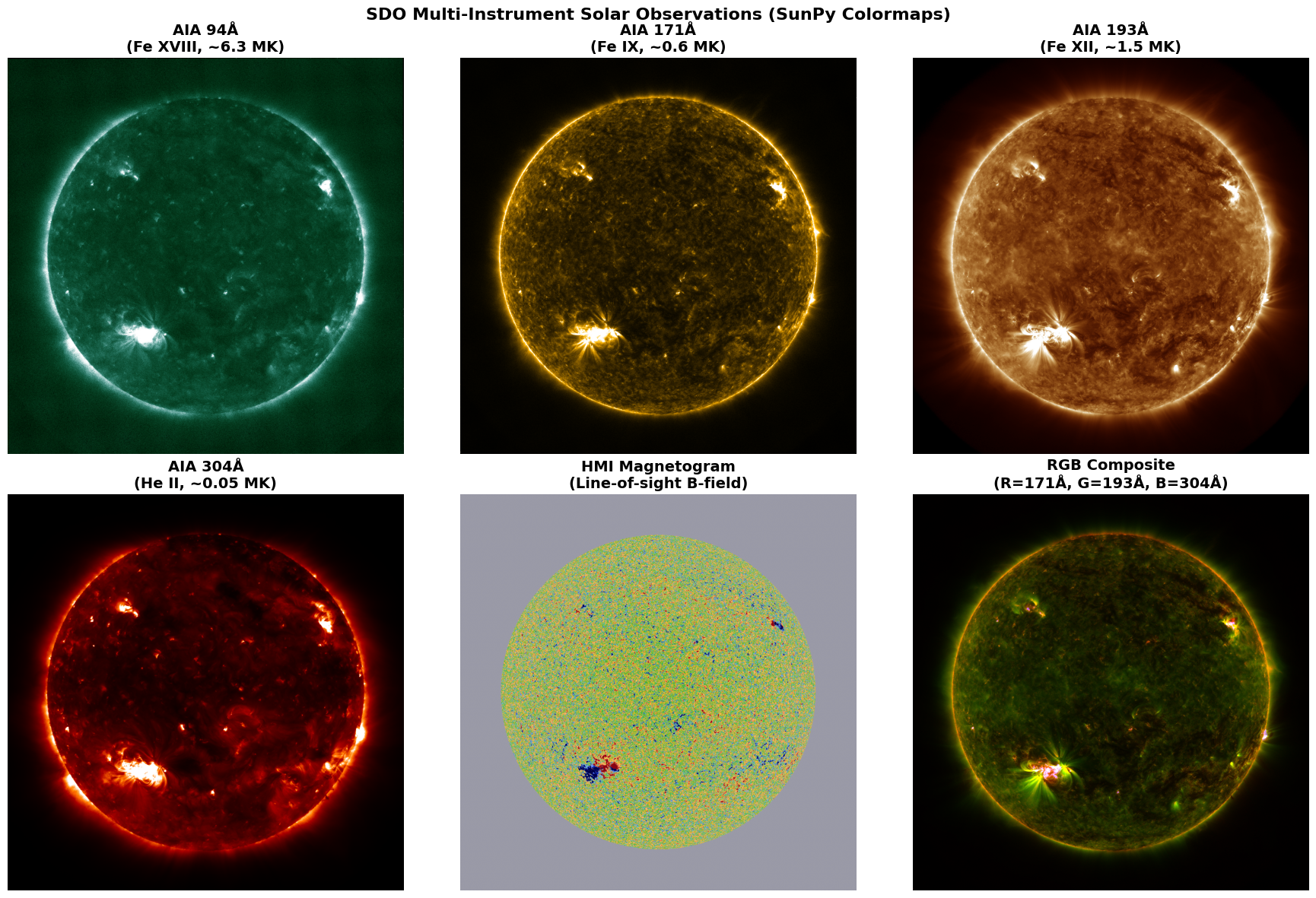 The visualization demonstrates: - AIA channels at different wavelengths (94Å, 171Å, 193Å, 304Å) with proper sdoaia### colormaps - HMI magnetogram displaying magnetic field structure with hmimag colormap - RGB composite combining multiple wavelengths for context - Proper normalization matching professional solar physics standards (1st-99.5th percentile)